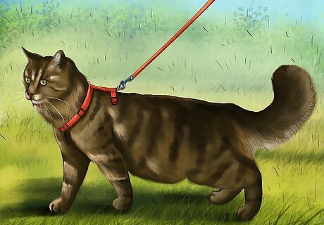 Take your cat outside on a leash. You can also provide your cat with space to sunbathe by taking them outside on a leash. It is relatively easy to leash train a cat. Try tethering your cat to a stationary object, such as a tree in your backyard. Your cat can enjoy sunbathing outside while you complete yard work or relax outside. Do not leave your cat tethered outside unsupervised because they may get caught or tangled.