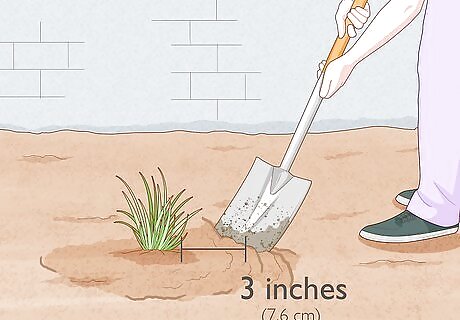 Loosen the soil around your chives with a shovel. Place your shovel about 3 inches (7.6 cm) away from the base of the chive stalks and push it straight down into the soil. Lower the handle on the shovel closer to the ground to loosen the soil under the plant. Continue loosening the soil in a circle around the chives so you can easily pull the bulbs out by hand. You may also use a gardening fork if it’s easier for you. If you’re taking chives out of a pot, then use a smaller trowel to loosen the soil instead.
