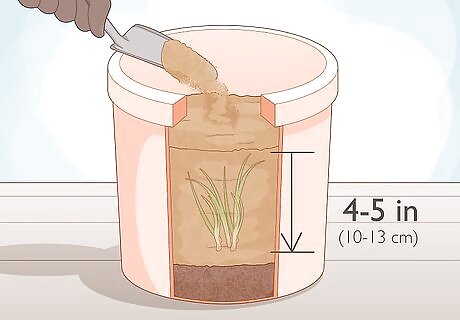 Plant 4–6 small bulbs and fill in soil so they’re 4–5 in (10–13 cm) deep. Set a group of bulbs on the soil in the center of the pot and hold the stalks upright. Fill in the rest of your potting mix around the bulb so the cut ends of the stalks are just above the top level of the soil. Lightly pack the soil so it forms good contact with the bulbs.