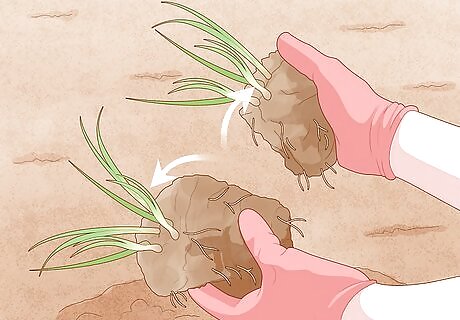Pull apart the chive bulbs into clumps that contain 4–6 each. Gently pull the chives out of the soil and set them on their side so you can easily access the bulbs. Grab a small clump of bulbs and pull them apart from one another to separate them. You can either separate individual bulbs or keep them in small clumps of 4–6 bulbs so they’re easier to plant. Wear gardening gloves to protect your skin and get a better grip on the bulbs. Discard any bulbs that look discolored or rotten.Tip: If you aren’t able to break the bulbs apart by hand, use a small gardening knife to cut through the roots holding them together.
