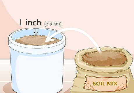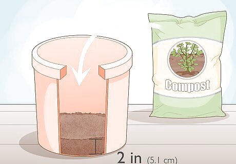 Prepare a pot with 2 in (5.1 cm) of soil and compost mix. Get an 8 in × 8 in (20 cm × 20 cm) pot with drainage holes so your chives have room to grow. Pick a potting mix that’s specialized for herbs since they usually contain all the necessary nutrients chives need. Fill the bottom 2–3 inches (5.1–7.6 cm) of the pot with loose soil. You can buy a potting mix with compost from a gardening store. If you can’t find a potting mix with compost, combine 3 parts soil with 1 part compost to make your own.