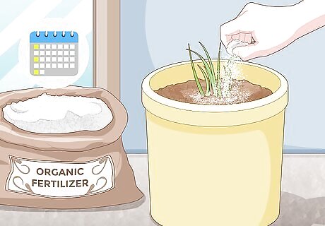 Use organic fertilizer every 2–4 weeks to provide nutrients to your chives. Spread a thin layer of organic fertilizer on the soil’s surface so it doesn’t touch your plant. Immediately water the soil so the fertilizer can absorb into it and provide your chives with necessary nutrients. Repeat the process once a month for the most effectiveness. You can buy organic fertilizers from your local gardening store. If you can’t find an organic soil, use a liquid 20-20-20 fertilizer instead.