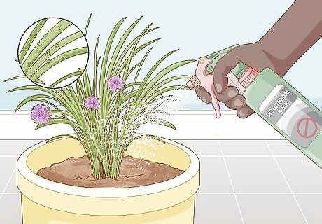 Spray the chives with insecticidal soap if you notice any pests. While chives usually don’t attract bugs, they may still have spider mites or mealybugs from time to time. Look for liquid insecticidal soap and spray it directly on the stalks. Reapply the insecticidal soap every 2–3 weeks if you still see pests on your plants.Tip: Wash the chives with clean water before you eat them to remove any insecticides you applied.