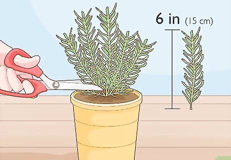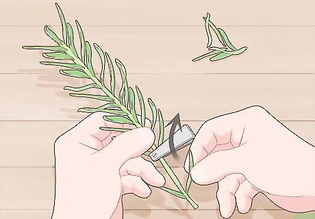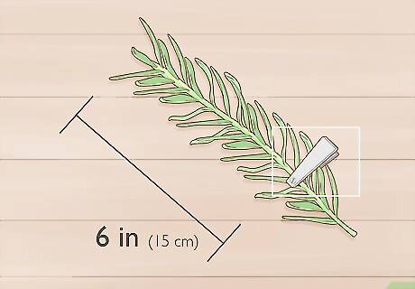 Clip the stem to make it about 6 in (15 cm) long. Plan on cutting the stem underneath one of the leaves. Use something sharp that can slice cleanly through the stems, such as pruning shears or a cutting knife. If you’re trimming fresh cuttings from your garden, try cutting the stem upward at a diagonal angle to help encourage new roots to grow. If you’re working with store-bought herbs that have already been cut to size, don’t worry about cutting at an angle. Snip the bottom off each stem so they can grow new roots.