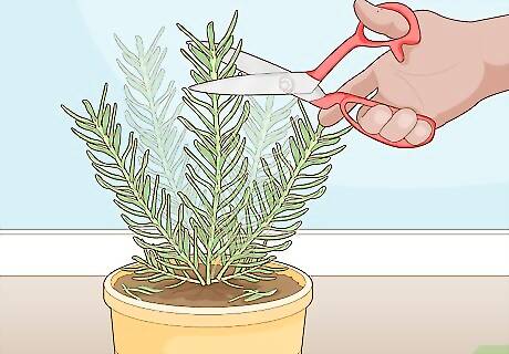 Watch for roots to grow after 2 to 3 weeks. Over time, expect to see little white or brown strands spreading from the cut at the bottom of each stem. It is a sign that the herbs are strong and healthy. If the herbs don’t sprout roots, they may not be doing well. Check them over for brown discolorations, soft spots, and other signs of rotting. If an herb has begun to rot, throw it away. Sometimes cuttings don’t take to water even when you do everything right. Once the herbs grow roots about 2 in (5.1 cm) long, you can transplant them to a more permanent home. Try putting them in pots filled with a quality potting soil.