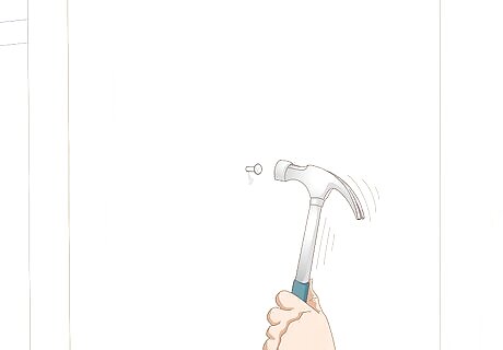 Drive a small nail into the wall. Tap the nail in gently to avoid damaging the paint or drywall surrounding the hole any more than necessary. Leave at least ⁄2 inch (1.3 cm) protruding from the wall to ensure that the hanging ribbon has plenty of room to sit comfortably. Hammering the nail in at a slight downward angle will make the ribbon less likely to slip off. The smaller the nail, the less damage it will do, and the less noticeable it will be. Something like a 4D or 6D finishing nail will be your best bet. Another option is to use a thumbtack rather than a nail. The spikes on most thumbtacks are more slender than even the smallest finishing nail, and you'll be barely be able to notice the holes they leave behind.