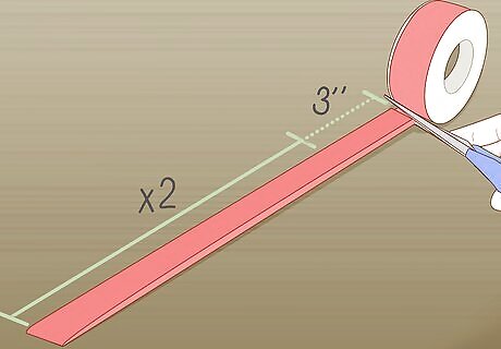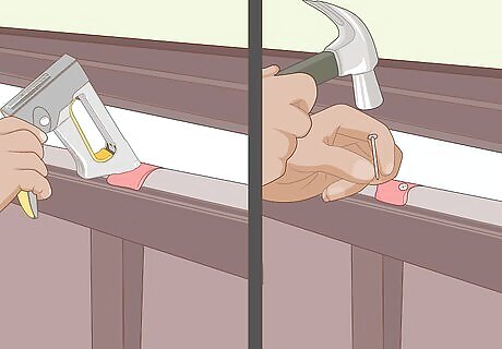 Use a staple gun or hammer and nails to secure the ribbon to the top of the door. Pound 2 small, like ⁄2 in (1.3 cm), nails through the ribbon into the top of the door with a hammer. Use a staple gun and place 2 staples through the ribbon into the door as an easier alternative if you have one. This will not work for doors made of metal or other hard material that you can’t put nails or staples into. For these types of doors, you will have to use a hook or hanger of some kind.