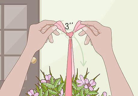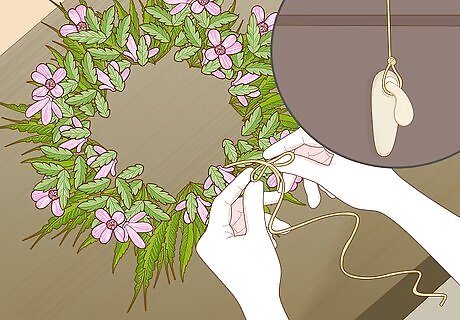 Wrap the ribbon around the wreath and tie a knot about 3 in (7.6 cm) from the end. Slide 1 end of the ribbon behind the wreath and pull it through so both ends meet. Tie 1 end around the other, then rotate the ribbon so the knot is hidden behind the wreath. If you don’t want ribbon to show on the front side of your wreath, then you can also try to loop the ribbon around the inner frame of the wreath.