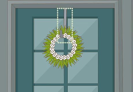 Tie the twine around your wreath and attach the other end to the hook. Loop 1 end of the twine around the top middle of the wreath and tie it in place so the knot is at the back. Put the other end over the top of the door and tie it around the hook on the other side so the wreath is at the desired height. If your wreath has an inner frame, you can tie the twine to it to hide it more so it doesn’t show on the front.