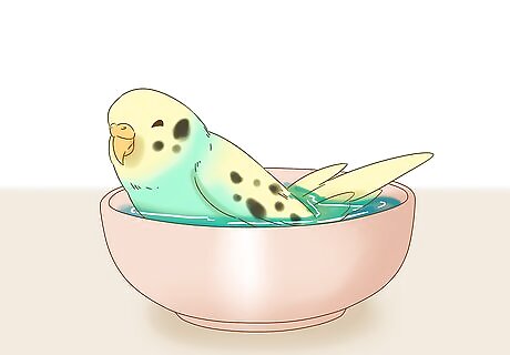 Bathe your bird in a bowl or sink. Fill a shallow bowl or sink up with 2–3 inches (5.1–7.6 cm) of room temperature water. If your bird has never taken a bath before, keep it short and don't force the bird into the water. Make sure you dry your bird as much as possible with a towel, then place in a room without any drafts for a while. Don’t use soap as it can remove naturally occurring oils from your bird’s feathers.