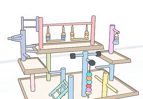 Build a bird-friendly play gym. To build an environment you and your bird will find entertaining, you can start with common household objects. Gather up things like cardboard boxes, index cards, twigs and pieces of wood, paper towel tubes, string, building blocks, as well as pipes and wire shelves. Connect the elements with hot glue, wood glue, or whatever best suits the materials you’re using. When you have a solid structure together, incorporate toys, water, and food stations. Make sure the materials you’re using are non-toxic and safe for your pet. Be creative in assembling these odds and ends. Add in tunnels and perches, swings and high-up hiding spots. Connect sturdy building block toys to create a tower. Use stronger materials for support, and make sure your play gym is sturdy enough for your bird to navigate. The possibilities for your bird play gym are endless! Try suspending a chew toy or string of bells from your play gym foundation. Add a circular playpen to the base, made out of taped-together index cards. Make a diner or snack bar out of cardboard, using the bottom halves of paper cups for food dishes. If you really want to make a splash, turn your play gym into a waterpark with bowls of water and gentle mist from a spray bottle.