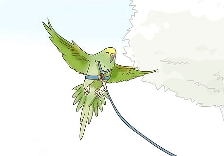 Bring your bird outside in a harness or cage to play in the fresh air. Your bird's wings must be clipped before you take your bird outside. Make sure you only do this activity on a warm day and be sure to keep your bird save with some kind of restraint, whether it’s a cage or a harness. Bring out your pet’s favorite play gyms and plastic toys, as well as some food and water. You can also buy a harness for your bird. Slowly introduce the harness, and let your bird wear it for short periods at first until it gets completely comfortable.