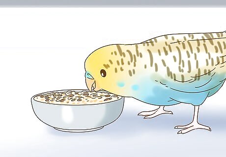 Introduce new foods and treats into your bird’s diet. Instead of giving your bird the same bird seed mix every day, try experimenting with different bird-safe foods and find out what your bird likes to eat. Look up fun and easy recipes to make mealtime more interesting. Also, since many birds are natural foragers, try hiding these exciting new foods for your bird to discover. If your bird doesn't eat what you’ve prepared at first, sprinkle their old bird seed on top of the new snack.