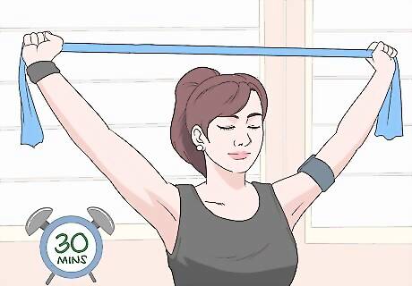 Exercise for 30 minutes on most days of the week. Getting regular physical activity is great for your overall health and it also helps to improve your lung function. Aim for about 30 minutes of moderate physical activity on most days of the week. You can do anything that you enjoy, such as walking, riding a bike, or swimming. Include resistance training for your chest and shoulders to build muscle and help promote better posture. If you’re able, do exercises that challenge your breathing, such as walking, jogging, or riding a bike up a hill. This will help to increase your lung capacity.