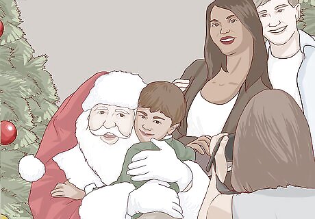 Get them smiling. Now for the hard part: taking a good picture. Giving an overwhelmed youngster some gentle cues to “say cheese” or flash their pearly whites can help put them at ease by calling to mind happy family photo sessions. Chances are, they will be looking your way for any indication of how they should feel, so the more ecstatic you appear, the better the chances that happy feelings will flow. There is no guarantee that your child will be as thrilled by the spectacle as you are. If they seem totally overwhelmed or start pitching a fit, get them out of there and try again next year. Be happy with what you get. Even if somebody blinks or screams their head off, it doesn’t mean the photo is ruined. Try to enjoy the experience and the memories that came from it.