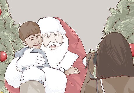 Offer coaching and encouragement. While the photographer is snapping the pictures, you can take part in the process from the sidelines. Lavish your child with praise to help keep them calm. Throw them the thumbs up, grin big and tell them how lucky they are for the opportunity to be introduced to the one and only Kris Kringle. Don’t try to do the photographer’s job for them. They are usually trained in ways of making distraught kids more comfortable in front of the camera.