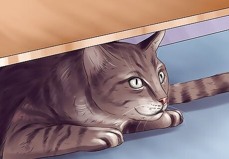 Check in places the cat can hide. Out of their territory, cats will hide in places where predators cannot find them. The disorientation will lead your cat to find somewhere safe to hide. Start by looking for the cat under decks, porches, houses, and cars. You also may want to look in thick wooded areas or areas with plants that will conceal the cat. Check any hole, corner, or crevice your cat can fit. The cat probably won’t meow to protect itself, so you will have to look for them.