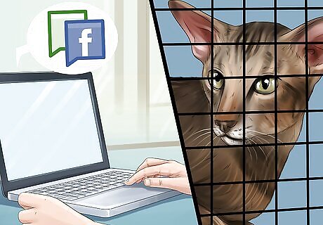 Try to find the owner if you find a disoriented cat that isn't yours. You may come across a scared, disoriented cat in your yard. If this occurs, try asking around the neighborhood about any lost cats. Most cats stay close to their home when they have become disoriented. If no one in your neighborhood or a nearby neighborhood has lost a cat, contact the local Humane Society and animal shelters. Owners with missing pets often contact shelters to see if someone has reported any found pets. Look for missing pet signs. Many people put up signs about their missing pets. Check around your area for any fliers or posters. Post on social media. Most towns and communities have Facebook discussion pages, so check if your area has one where you can post the information about the found cat.