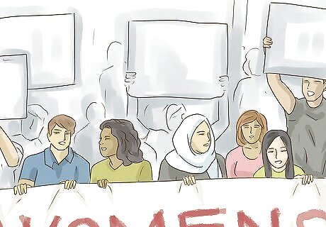 Go to rallies and join others promoting gender equality and woman’s rights. Rallies are a great way to draw attention to the issues that women are facing today. Every year there is a Women’s March in January held in Washington D.C., but with many other cities holding simultaneous marches. Plan to take part in the march and keep an eye out for other events you can attend. A lot of times, marches and rallies spring up in response to something happening in the social or political landscape. Get online and pay attention to the news to stay aware of what is happening in your community and around the world.