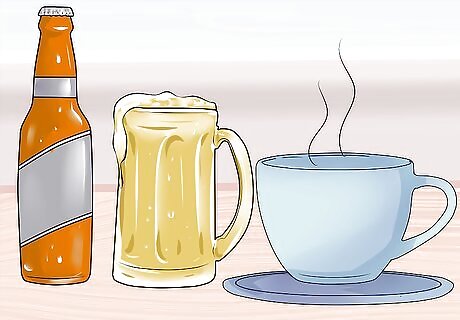 Avoid caffeine and alcohol. Though you may need your morning coffee to get through the day, having too much caffeine through coffee, caffeinated teas, or energy drinks can lead to feelings of hunger and fatigue. This could then cause you to cheat on your diet or eat an unplanned meal. As well, alcohol can lead to hunger and unhealthy eating, especially at night when you’ve been drinking for several hours. If you tend to drink lots of coffee or enjoy a few drinks on occasion, try to have a glass of water between each cup of coffee or each drink. This will keep you hydrated and help to limit your hunger pangs.