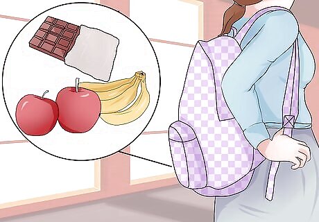 Carry small snacks with you in your bag. Be a smart eater by packing small, healthy snacks in your bag that you can reach for inconspicuously throughout the day. This will allow you to stay full without eating empty calories. It will also make others less curious about your diet, as you will appear to be eating often throughout the day via snacking. Snacks like raw almonds, dark chocolate, and veggie sticks with peanut butter or hummus can help to keep you full and give you energy between meals. You can also cut up fruits like apples, pears, and bananas for healthy snacks that won’t lead to a sugar crash later in the day.
