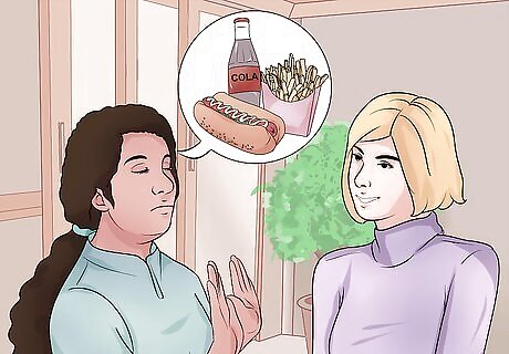 Eat your meals alone or with others who are dieting. To avoid having to defend or address your diet, you may want to consider having your meals alone. This way, you will not need to hide your diet and can eat comfortably without feeling judged by others. Eating alone can be an isolating and unhealthy experience, especially if it is done on a daily basis for all your meals. You may want to consider instead eating around individuals who will not question your diet or ask you personal questions about your eating habits as an alternative to eating all your meals alone. This could be friends that are also dieting or individuals that you met through a weight loss program.