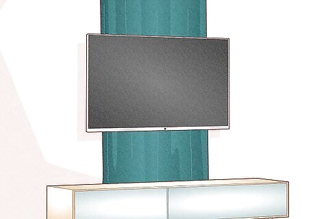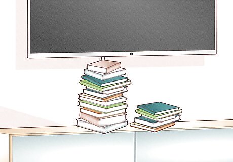 Stack books along the shelf or cabinet for a low-mounted TV. Strategically place taller books in front of the wires. Experiment with lying some books horizontally and stacking others on top until the wires are covered and you have the look you want. Try adding other decorative items like a plant or vase filled with artificial flowers or branches.