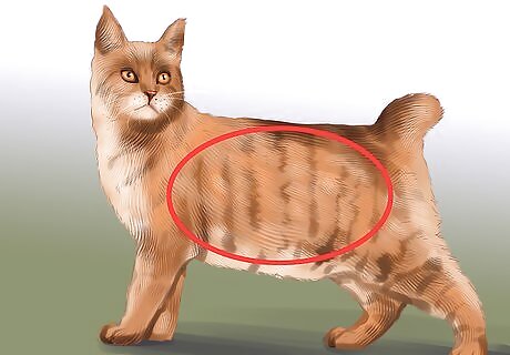 Examine the cat’s coat. The pixiebob has a thick coat that is relatively resistant to the elements. Thus, the pixiebob is well suited to the outdoors in colder climates. Ultimately, by looking at the cat’s coat, you’ll get a better idea of whether it is a pixiebob. The coat: Is soft, thick, and has a woolly feeling. May be shorthair or longhair. Is usually brown spotted and tabby colored. It could be many different shades of brown. Will have a spotted stomach.