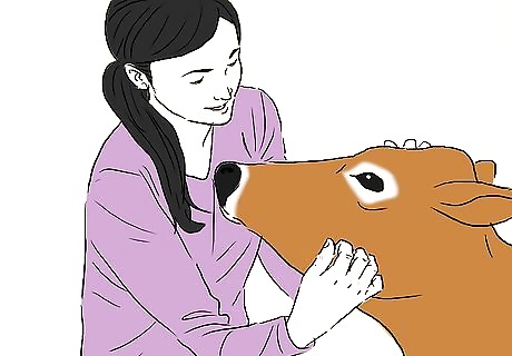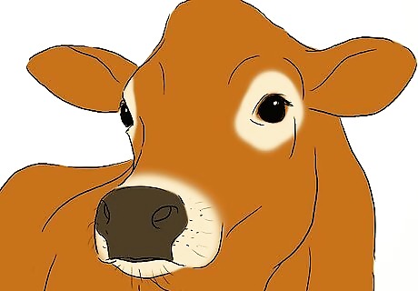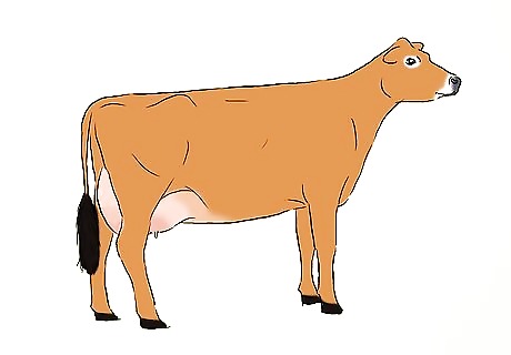 Study the characteristics of the breed. Note the following: Colouration: Jersey cattle coat colour ranges from a light fawn to almost black. Some Jerseys may have white on them, from diamond-shaped patches on their shoulders or hips, to white legs and a stripe from the top of the shoulder down to behind the elbows. Black Jerseys almost always has a tan-coloured saddle in the middle of their backs, from the withers to the top of the loins. They also have lighter colouration around their noses and eyes, and on the inside of each leg. A lot of fawn-coloured mature cattle have a darker face from just below their poll or just above their eye-brows to just before their noses. There will often be lighter colouration around their eyes and noses. Bulls often have darker colouration from the base of their heads to their shoulders. All Jerseys have dark eyes and dark pigmented skin around their eyes and their noses. They also have black hooves and a dark tail-switch. Those dark noses and dark eyes in Jersey calves make them look adorably cute, much more so than any other bovine calf of any other breed. Body type and characteristics: Jerseys look to be more finer-boned and bodied than most any beef breed or even Holsteins. Just like Holsteins, though, Jerseys are quite angular in body type because they are selected to be a milk-producer and not a beef-producer. They have the same funnel butt characteristics that Holsteins have, and are quite thin and bony as well. Jerseys are a lot smaller than Holsteins though, a bit more than half the size, with a mature weight of only around 1000 lbs for cows and only 1500 lbs for bulls. Jersey cows have a large udder on them to accommodate for the demand for producing more milk than their calves would normally receive. Head characteristics: Jersey cows are very feminine looking animals, with a finer, more feminine head than Hereford or Angus cows, with a similar head-shape (though a little less robust) as Shorthorn cows do. Jerseys are a naturally horned breed, though there are genetics for polled cattle as well. Other characteristics: Jersey cows are quiet and very pretty animals, but are often known to have quite the sassy-girl attitude at milking time! This is because they are known to be kickers when you're trying to prepare their udders before milking, or just when you're trying to milk them out. But, even though they are notorious kickers, they have milk that is more rich in butterfat than any other dairy cow, which is great to use for dairy products like cheese, butter, and ice cream. Jersey bulls are infamous for their aggressiveness and unpredictability, and are often more dangerous to handle and be around than even Holstein bulls.