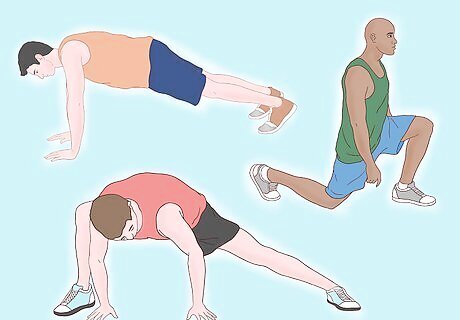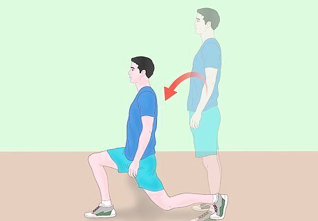 Use lunges to build stronger legs. Although training your upper body and core is important, strengthening your legs is just as important when increasing your pitching velocity. By strength training your legs you can help build a solid pitching stance and generate more power behind your pitches. Try some of these motions to do a proper lunge and strengthen your legs: Stand straight with your feet apart at shoulder width. Take a long step forward with one leg. Drop your rear leg to the ground, straightening it out. Bend your front leg at the knee. Never let your knee go in front of your toes to prevent injury. Stand up straight again and repeat the motion, leading with the other leg. You can hold dumbbells in your hands to increase the difficulty.