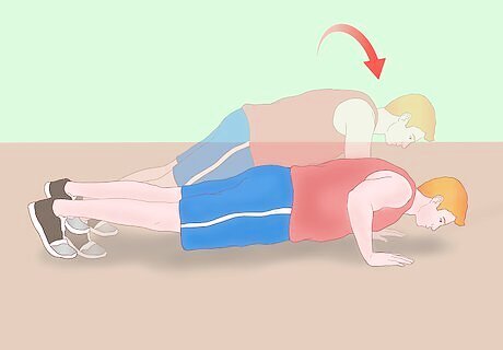 Build upper body power with push-ups. Push-ups are a simple maneuver that uses your own body weight to strengthen muscles and build power. The push-up will mainly target your upper body but will also work your core and legs. Use the following push-up technique to stay safe and build pitching power: Go into a plank position, resting on your hands and toes. Your hands should be even with and just a bit wider than your shoulders. Keep your body and torso straight. Lower your body down to the ground by bending at the elbows. Your entire upper body and arms should be supporting your weight as you lower yourself down. At the bottom of the motion push yourself back up to the starting position.