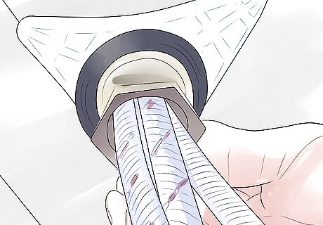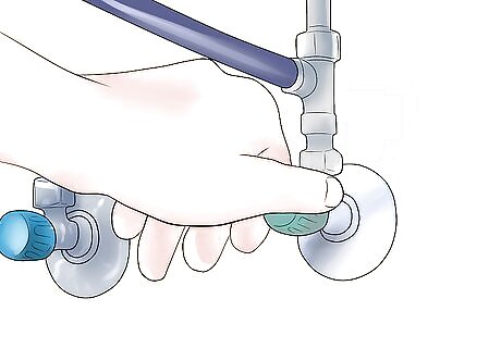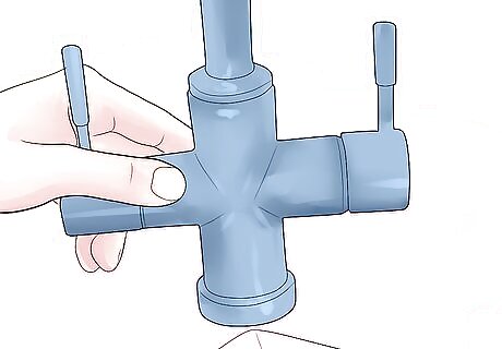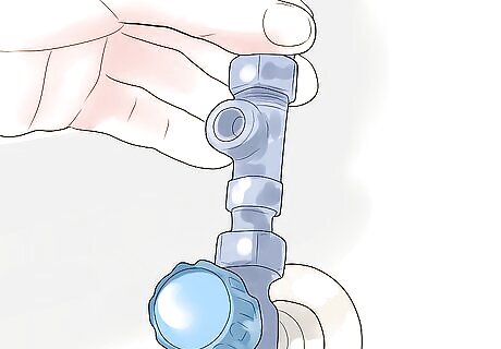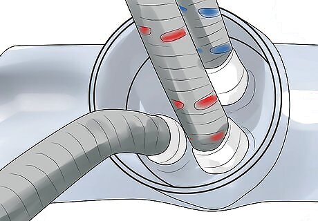 Attach the hoses to the inside of the tap. Screw the blue hoses into the hole marked “C.” Screw the red hose into the hole marked “H.” Screw the last hose into the hole marked “B.” Make sure they are secure.