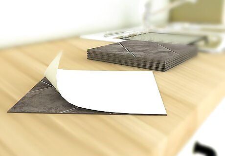 Stick your tiles to the wall. Peel the backing off the tiles, and stick them to your desired location. Always start from the bottom center of the wall and work your way out. Firmly press the tiles each time you stick them to the wall, to make sure they are firmly adhered. Hold a straight edge or level to the sides of your tile as your press, to make sure that they don’t shift out of alignment.