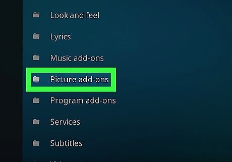 Select a category. Click the topic that describes the type of add-on you want to install. For example, to install a TV network like CNN, select Video add-ons. To install an add-on that displays subtitles for movies, select Subtitles.