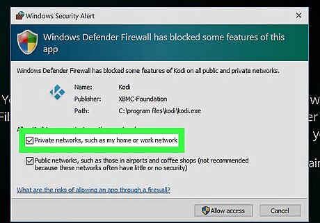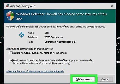 Select your firewall preferences. If you see a pop-up that says “Windows Defender Firewall has blocked some features of this app,” choose one or both of these options: Check “Private networks” to ensure you can use Kodi on your own local network. If you also want to use Kodi on a public WiFi connection (such as in a cafe), check “Public networks” as well.