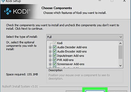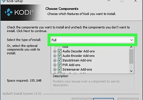 Choose an installation type and click Next. To install the full version of Kodi (recommended), leave “Full” selected in the drop-down menu. If you know you don’t need an element of Kodi that appears in the list, remove the check mark from that element.