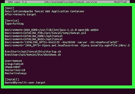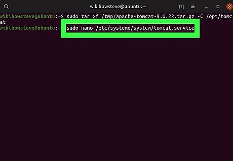 Run sudo nano /etc/systemd/system/tomcat.service. This will create a new file named "tomcat.service," and allow you to edit its contents with your default text editor.