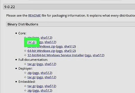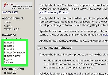 Click the Tomcat version you want under "Download" on the left sidebar. You'll find the available Tomcat version on a navigation menu on the left-hand side of the page. You can select Tomcat 9 or another version here. If you want to see which versions are compatible with your system, click Which version? under the Download heading here.