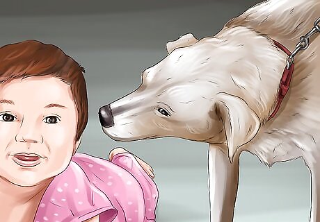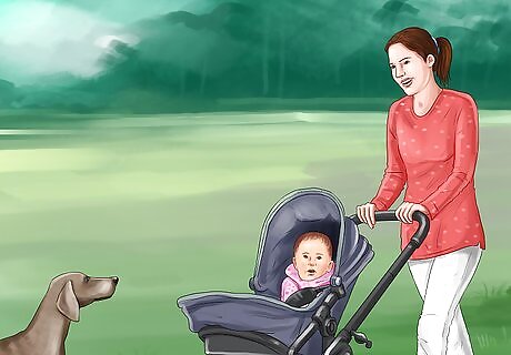 Expose your dog to babies in parks. Take your dog for a walk in the park and observe their reactions to babies. See how your dog looks at babies from a distance. If your dog growls or reacts aggressively, you should consult a dog trainer immediately to find a solution. If your dog seems neutral or fine with babies, you can try walking closer to them and just get your dog familiar with the general looks and sounds of babies.