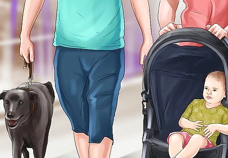 Go for a walk with a friend who has a baby. Ask a friend or a family member with a baby whether you could go for a walk with them with your dog. Keep your dog on a leash and walk a safe distance from the baby stroller. By walking with your friend’s baby, your dog will get used to the sights and sounds of babies. You could tease out this idea by saying to your friend: “I am trying to get my dog used to the idea of a new family member in the house. I have heard it can be good to expose dogs to babies prior to the arrival of a new family member. Would you be up for a walk with my pooch and I?”