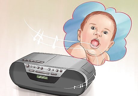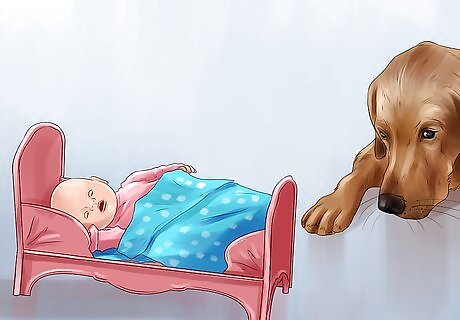 Play a recording of baby sounds. Play a soft recording of baby noises in the background when you are hanging out with your dog or cleaning. Your dog will get used to the sounds. If they are behaving well, you can try turning up the volume slightly.