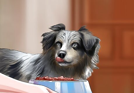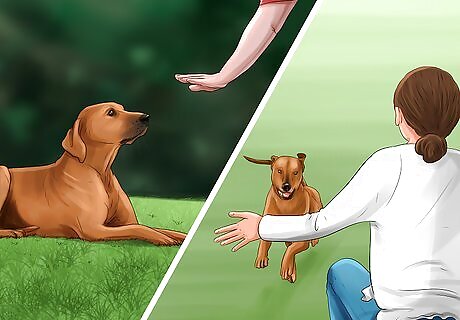 Ask the person to offer the dog a treat. You could ask the new family member or visitor to offer the dog a treat. This could give your dog a favorable impression. Give the new family member a dog treat. Tell them to ask your dog to “come,” “sit” or perform another basic command that they know. If your dog follows the command, get the new family member to give the treat. You could also try standing alongside the new family member while they ask your dog to perform the command. If you need to try a different tactic, you could ask your dog to come and sit while standing next to the new family member. Once the dog has performed the command, get the new family member to offer the treat. Do not let him feed by hand because the dog might take it as a threat or as an alarm. Instead he can place it in his designated eating bowl.
