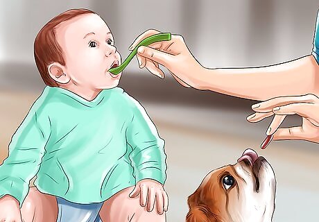 Give your dog treats when you are feeding the baby. To get your dog used to the intimate attention you give your baby, you should give them treats when you are feeding the baby. This will make a positive connection with feeding time. Review the list of ingredients when you are shopping for dog treats. If there are ingredients you have never heard of, you probably shouldn’t get the treat. Generally, avoid artificial ingredients and look for natural ingredients. Shop around until you find the treats that your dog likes.