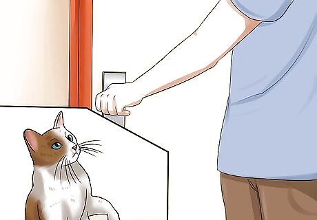 Put your fish away. When you leave the house, put your fish in a locked room so that the cat can’t get to it. Even if you believe your cat is trained to leave the fish alone, eliminating the possibility of mischief keeps your cat from being tempted.