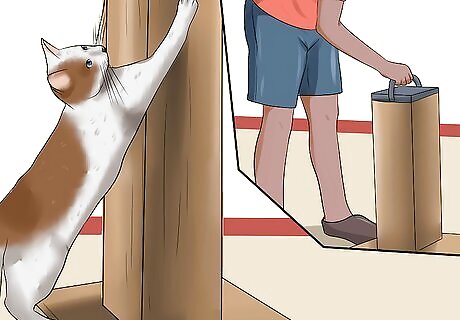Keep your cat off of surfaces. Cats naturally enjoy being up high where they can survey their environment, but that also means they like to get up on counters and tables—where fish usually live. You can train them to stay off of your surfaces, however, by doing the following: Taking everything off of tabletops and counters, so there’s nothing to investigate. Providing high, safe places to climb up to, like scratching posts. Placing treats at safe spots both on the floor and up on cat posts. Removing food and things of interest from the area near the fish bowl.