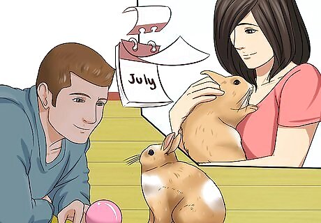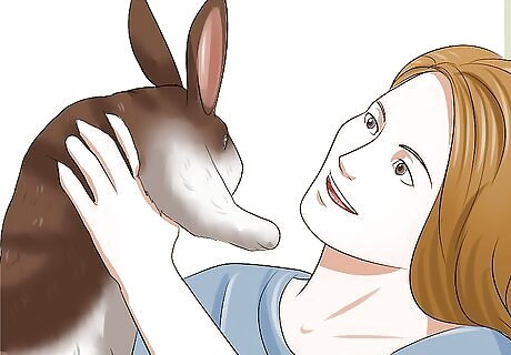 Play and interact with your rabbit. You will also have to commit enough time to play and interact with your rabbit every day. Rabbits need to be let out of their cage or hutch for at least a few hours each day. You will have to be there to supervise to make sure they stay safe. The best time to do is this is generally around dusk when rabbits start to become active. Think about whether or not you are normally home around that time and will be able to sit out with a rabbit while he explores and exercises. In this time you will be able to interact with him and bond. Rabbits tend to be shy, but can become very friendly once they get to know someone.