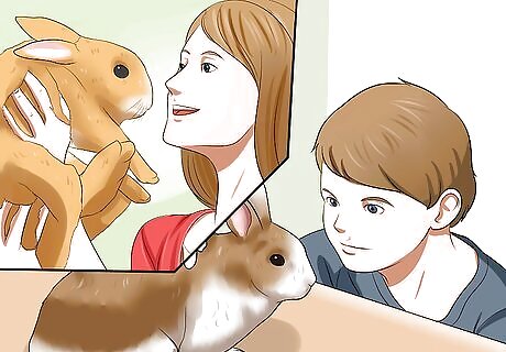 Have a rabbit friendly household. You need to think of the environment you are considering bringing a rabbit into broadly. Ask yourself if you have a rabbit friendly family who will be enthusiastic and friendly. If you get a rabbit you might need help looking after him, so talk to your family about whether they would be able to help you out occasionally. Try to agree on who is responsible for what. Perhaps you will take turns cleaning out the hutch, or feeding the bunny. Consider drawing up a rota. You should also consider any pets you already have, and how these might get along with a new rabbit arrival. It is perfectly possible for cats and dogs to get along with and become friends with a rabbit. If you do already have a cat or a dog, think about how you will introduce them to a rabbit, and be prepared to help them get accustomed to each other. Dogs in particular can attack rabbits, so you should get some advice from your vet before bringing a dog and a rabbit together.