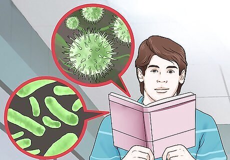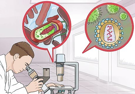 Identify the bacterial and viral causes of common illnesses. If you are suffering from a disease and you know what it is, figuring out whether you are being affected by bacteria or a virus can be as simple as looking up information about your illness. Common illnesses caused by bacteria and viruses include: Bacteria: pneumonia, food poisoning (commonly caused by E. coli), bacterial meningitis, strep throat, ear infections, wound infections, gonorrhea. Viruses: influenza, chickenpox, the common cold, hepatitis B, rubella, SARS, measles, Ebola, HPV, herpes, rabies, HIV (the virus that causes AIDS). Note that some illnesses, like diarrhea and "head colds," can be caused by either type of organism. If you don't know what your illness is exactly, it is harder to tell the difference between bacteria and a virus because the symptoms for each can be difficult to distinguish. Both bacteria and viruses can cause nausea, vomiting, elevated temperatures, fatigue, and general malaise. The best (and sometimes only) way to determine whether you have a bacterial or viral infection is to see your doctor. Your doctor will perform lab tests to determine what kind of infection you have. One way to confirm whether you have a virus or bacteria is to assess whether your current antibiotic treatments are effective. Antibiotics such as penicillin will only help if you have a bacterial infection, as opposed to a viral infection. This is why you should not take antibiotics unless your doctor has prescribed them. Most viral infections and diseases, including the common cold, do not have cures, but there are anti-viral drugs that can often help manage or limit the symptoms and severity.