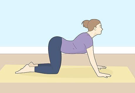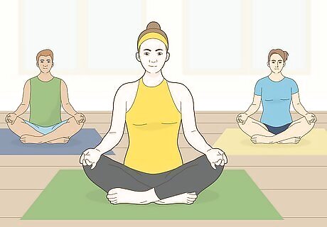 Pick up some poses. There are yoga poses that any beginner will have to know. These are basic and beginner’s level and include the Cat-Cow, the Half-Lord of the Fishes, and the Downward Dog. They are simple and easy to do. For the Cat-Cow, for example, start on your hands and knees with your spine flat. Then, inhale and drop your belly toward the floor and look up. Pull your spine upward, rounding your back, as you exhale. Repeat. Try the Downward Dog. Begin again on your hands and knees. As you inhale, push your hips upward, straighten your legs, and place your feet flat to the ground. Then, spread your fingers out and let your head hang down. Continue breathing in this pose. It may take a while for you to catch on. Try sitting in the back of the class, so that you can easily see your classmates and follow their movements. Don’t overdo it! Sit aside if you find a pose too challenging.