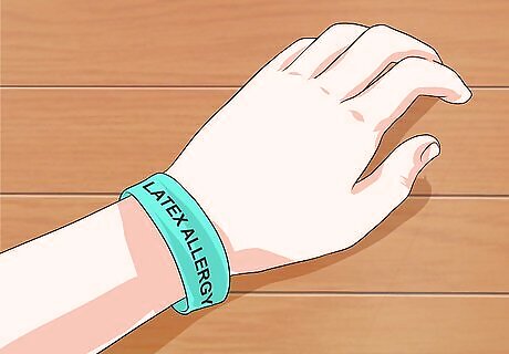 Inform others about your allergy. Tell other people about your allergy to help reduce your chances of coming into contact with latex. Your friends, family or coworkers can all help by keeping latex based products away from you or by providing safer alternatives. Let those around you know about your latex allergy to help prevent a future allergic reaction. Tell your doctor and other health care providers about your allergy. Talk to those in your workplace about your allergy. Let your family and friends know about your allergy. Consider wearing a medical bracelet that informs others about your allergy to latex.